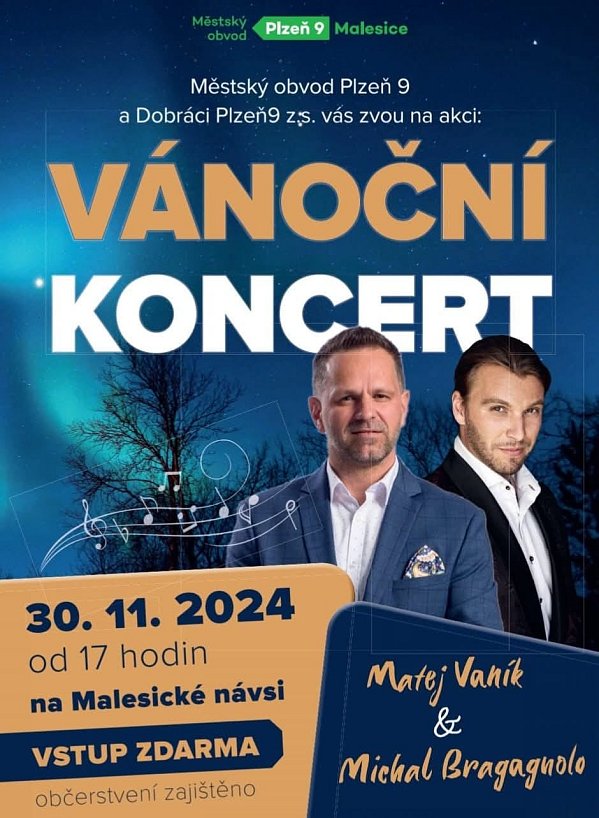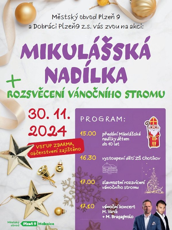 Strom je vyzdoben některými novými světlenými (stejně tak stromek ve Vlkýši) prvky. Slavnostně bude rozsvícen v sobotu, kdy se na Malesické návsi uskuteční mikulášská nadílka a koncert dětí i zpěváků Michala Bragagnola a Mateje Vaníka (viz plakát).