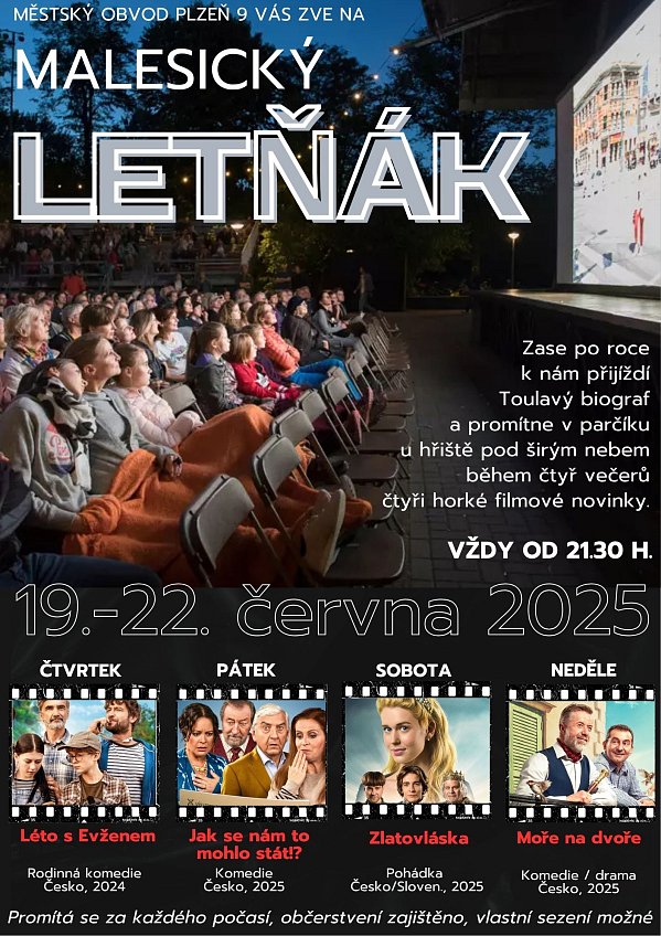 přijměte pozvání opět po roce na Malesický letňák. Toulavý biograf zavítá k nám do Malesic tento týden a promítne v parčíku u hřiště pod širým nebem během čtyř večerů od čtvrtka do neděle čtyři české filmové novinky (viz plakát). Těšíme se na viděnou.
